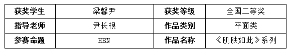 全国大学生广告艺术大赛是迄今为止全国规模大、覆盖高等院校广、参与师生人数多、作品水准高、受高校教师欢迎、有较大社会影响力的全国性高校文科竞赛,全国赛入围比例为0.5%,最终国家一等奖获奖比率仅为全国参赛作品的0.02%,大广赛被誉为A类学科竞赛中参赛学生和作品总数规模最大、竞争最激烈、获奖难度最高的赛事之一。本届大广赛参赛作品分为平面、视频、动画、互动、广播、策划案、文案、UI 、营销创客、公益十大类别,共有来自全国29个赛区1857所高校的学生参赛,参赛选手共计1866861人次,报送参赛作品932848组。经过学校初评、分赛区评选,参评前初筛,最终46552组作品参评,7189组作品获得国家级奖项,十大类别全国一等奖共计210余项,其中平面类竞争最为激烈(全国一等奖仅65项)。