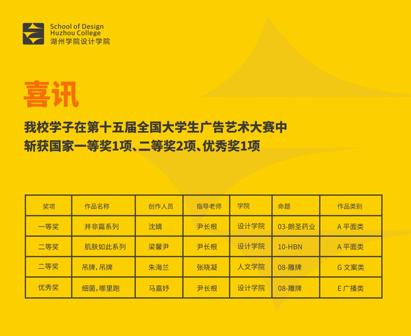 日前,由教育部高等教育司指导,中国高等教育学会、教育部高等学校新闻传播学类专业教学指导委员会共同主办的第15届全国大学生广告艺术大赛全国总评审工作落下帷幕。我校学子在比赛中,斩获平面类全国一等奖1项、二等奖2项、优秀奖1项,我校连续两届斩获该项赛事平面类全国一等奖。